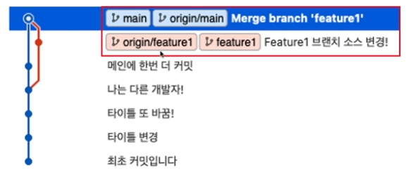Merge 후, main 브랜치는 feature1 브랜치와 합쳐져 Merge 결과를 반영해 한 커밋 나아갔다