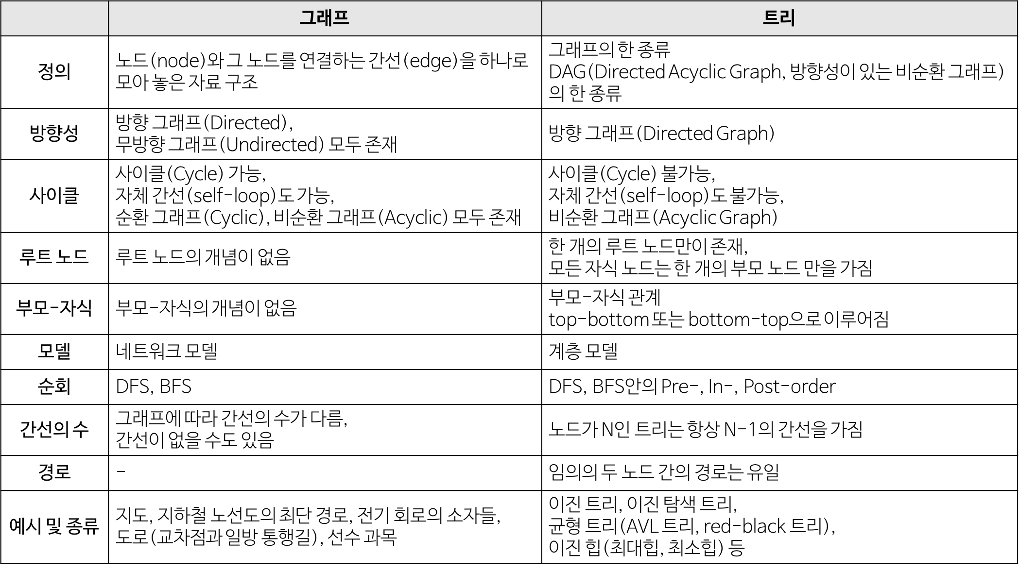 - 트리는 DAG(Directed Acyclic Graphs, 방향성이 있는 비순환 그래프)의 한 종류이다.