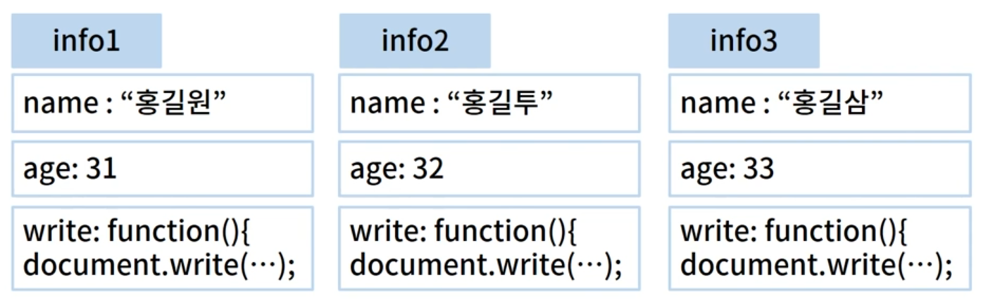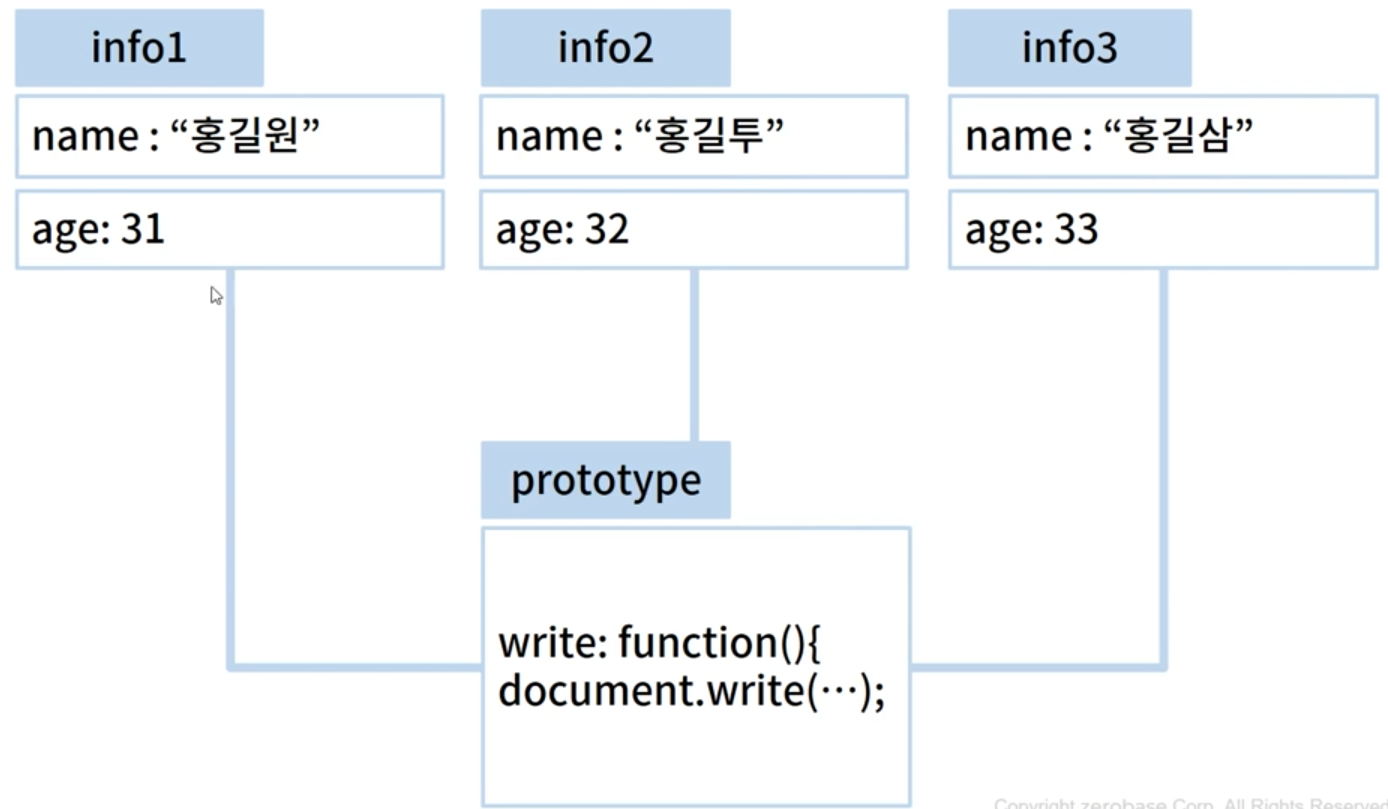 name과 age는 각각 다른 값들이기 때문에 메모리를 각자 할당해야 하지만, write 함수는 동일하기 때문에 하나의 메모리를 공유하는게 메모리에 효율적이여서 프로토타입을 생성해야한다.